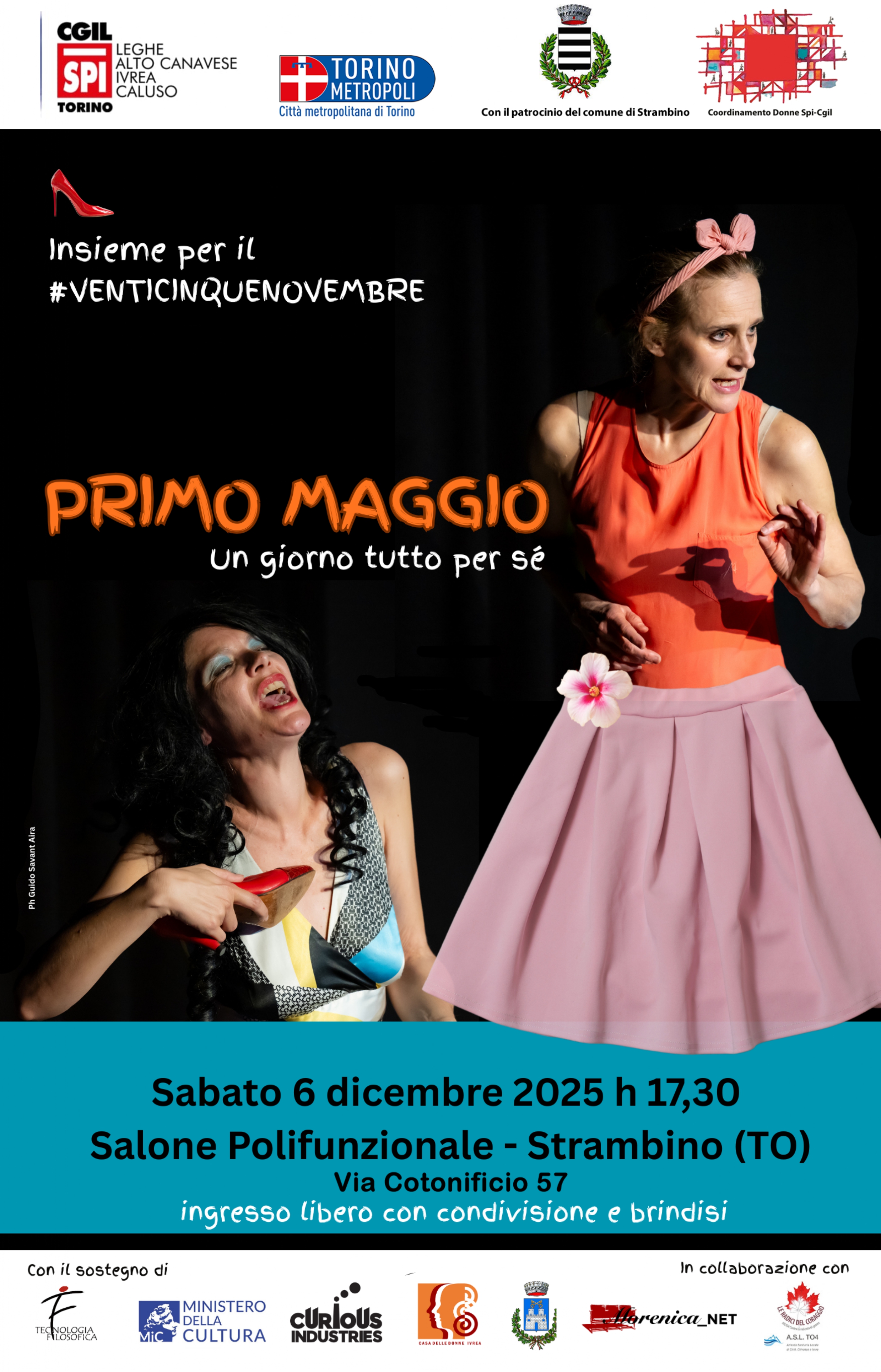 Lo spettacolo "PRIMO MAGGIO - Un giorno tutto per sé" avrà luogo sabato 6 Dicembre 2025 alle ore 17:30 presso il Salone Polifunzionale di via Cotonificio 57 a Strambino.