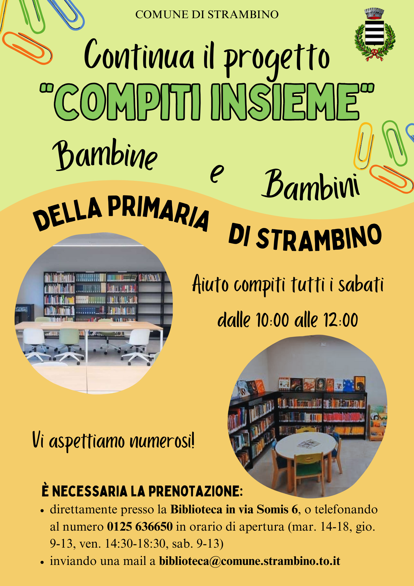 Prosegue il progetto “Compiti Insieme”, un’iniziativa dedicata ai bambini e alle bambine della Scuola Primaria di Strambino. A partire da sabato 6 settembre, ogni sabato mattina dalle ore 10:00 alle ore 12:00, presso la Biblioteca civica sarà possibile svolgere i compiti in un ambiente accogliente e stimolante, con il supporto di educatori qualificati.