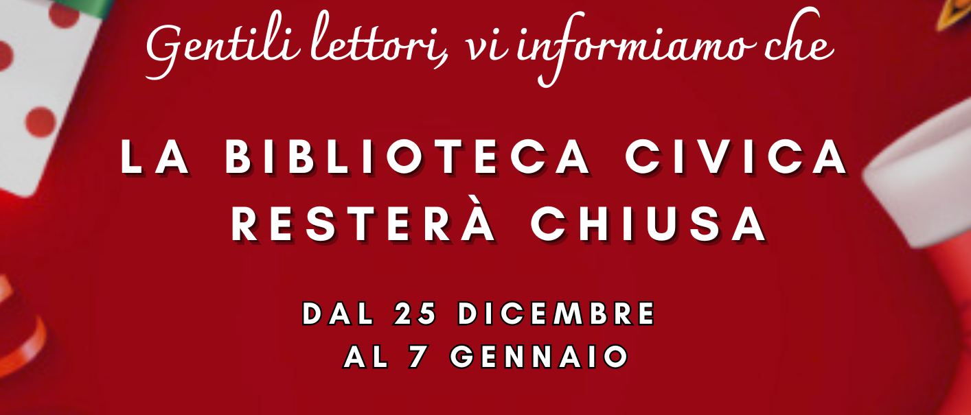 La Biblioteca Civica resterà chiusa durante il periodo natalizio dal 25 Dicembre al 7 Gennaio.