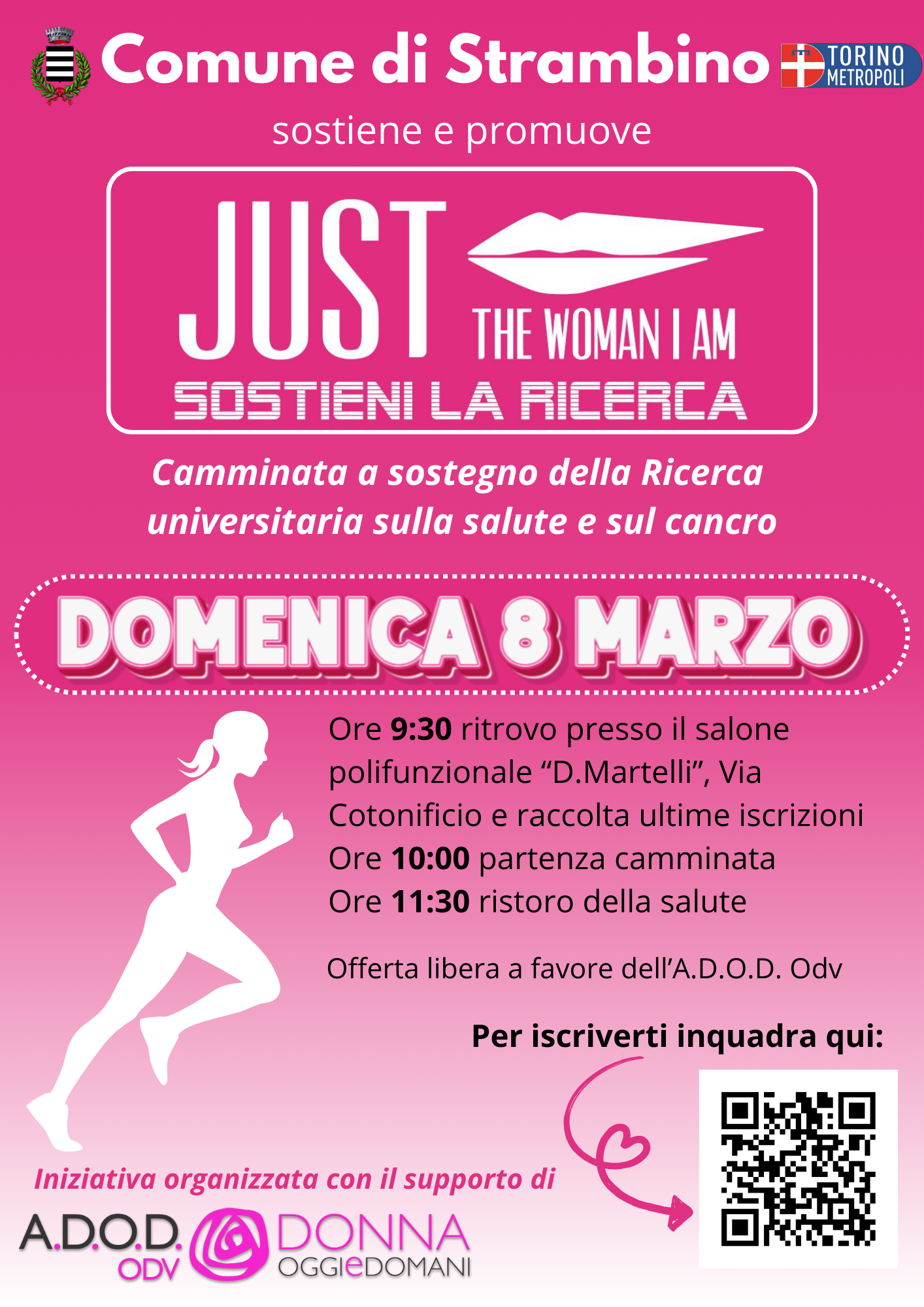 Domenica 8 marzo ti aspettiamo presso il Salone Polifunzionale "D. Martelli" (Via Cotonificio) a Strambino per iniziare insieme una camminata di 5km a sostegno della ricerca universitaria sulla salute e sul cancro.